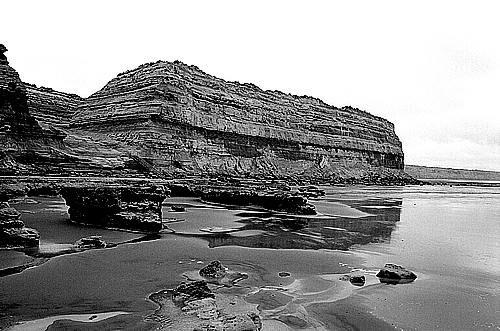 magnificent beach below high cliffs of sediment layered rocks, each layer a