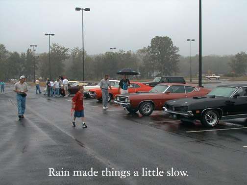 I got these pictures from Charles Hodge who recently attended the "rained out" Dwsonville, Georgia Mini Meet. I am sure we will have more pictures since it has been rescheduled for October 12, 2002. "Mike, got back from the dawsonville mini-meet a couple of hours ago. very few cars showed up because of the weather. it drizzled most of the time. going home was hell. it poured rain the entire 116 miles. the traffic was down to 35 and 40 on the fourlane. the good news is that it was still a great meet. i enjoyed meeting all the ford guys. especially rick and his dad. great guys. other good news is this was my cars first trip out of town since i started working on it. it ran like a top the entire way. even the stretches of 6 inch deep water didn't bother it at all. here are a few pictures. laterness, CH :-)