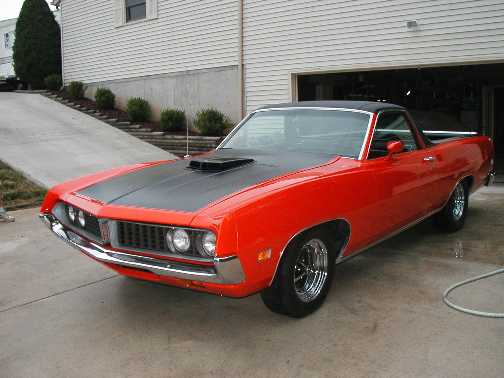 "Hi Mike, I am at it again - attached pictures of my latest project - this is going to be my daily driver(only in good weather though). It is a 1971 ranchero 500, 351 cleveland 4 barrel with ram air, Steering brakes and air with a c-6 trany. Ribbon Tach.
