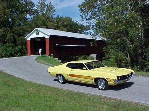 Jack Selig's Torino was chosen for a calendar photo shoot! Jack writes "Mike, My Torino was selected to be put in a muscle car calendar! The photos have already been taken and I will receive 2 dozen calendars. When i get them I will send you one . The day the calendar shoot was done in Scipio, Indiana. The photographers name was Roy Query of indianapolis and all he has done in the last 20 years is take pictures of cars all over the world and he has some interesting equipment. He has a platform on the top of his van for those special shots and says it usually takes about an hour to find the right spot for a photo shoot but in my case I found him one real quick. It was a fun day and all the people driving down the road were very nice to drive thru the grass around the car because he had small blocks under the wheels to level the car and the reflectors had to be set just right. He took about 50 pictures it was a day i wont soon forget thanks Mike.