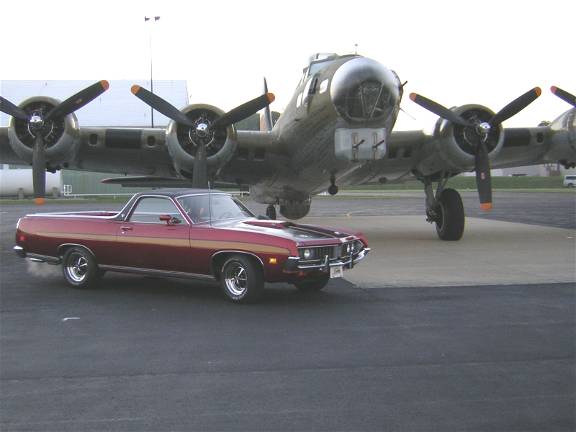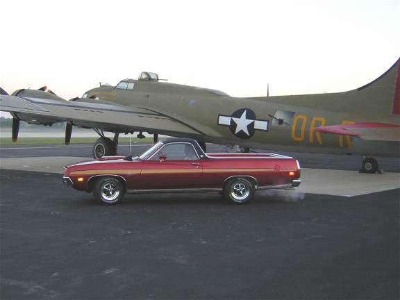 "My Name is Mark Banta of Martinsville Ind. I have sent several Pic's of My 1971 Ranchero it was that ivory collar and totaling un molested, when I found it. The former owner a school teacher had parked it in her barn in 1980, and when I bout it from her heir in 1999 it had only 41,237 miles on her. and believe it or not after putting fresh gas oil and a bat airing up tires it started and ran! I began the restoration ASAP I had to change a few thing though, she came as a stock 500 with a 302 2v c4 and 8.8 3.00 rear end and drum Brakes front and rear. Now Sporting new Cobra style paint stripes and hood vinyl top Magnum 500 wheels she also has a fresh cam'd 351c 4v rebuilt c4 with shift kit and a 9" L 3.00, Disc brakes all around, dual 2.5 exhaust with stainless tips, all new Interior and most recently added the stock A/C system. These ranchero's are so rare in the midwest I have yet to see one at any car show I've been to. I have taken home some award from every event I've attended since she was completed in aug of 2003.