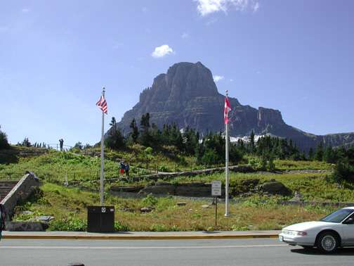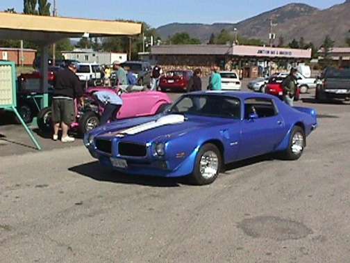 The following comes from Mark Smith, a friend in Kalispell, Montana. Mark writes "Mike, wow long time since my last note. As I have watched your site grow, and after getting your mini-meet notice knowing there was no way to make it over your way, I took your thought and organized a cruise for fellow employees at my office and our other mills and offices. Twenty cars showed up and within the next week after the cruise, 22 others called me to tell that they had not heard and to include them for next year. Hurumph! I thought more people read the company bulletin boards. Next year I will do an inter company "media blitz". We all work for Plum Creek Mfg. so I held it on Sunday September 9th and called it the Plum Crazy Sunday Drive. I had shirts made, they were a big hit. Here's a few pics. The picture of the flags held a heightened significance 2 days later. Had some pretty great company. A 70 Buick GS Stage 1, 68 427 4 spd 'Vette, 70 Jag E Type, 70 GTO Judge, 68 Camaro Z28, 28 Highboy Roadster, just to name a few. The guy with the Roadster has driven it to Kentucky, SoCal, and Arizona, (no top of course), true devotion. Because I own the only Torino in the company, I was thinking of awarding a trophy for the best looking green Torino. Just kidding. We met at a local A&W drive-in, had lunch and did a show n shine thing, and then drove to Logan Pass in Glacier National Park, an hour from the A&W. Everyone had a great time, no break-downs, beautiful day. If you and friends ever want to see Montana, let me know, GNP is spectacular, (you can bring your cars). The project I have been enslaved to for the last year and a half went into production test phase last week so my life just might become more my own.