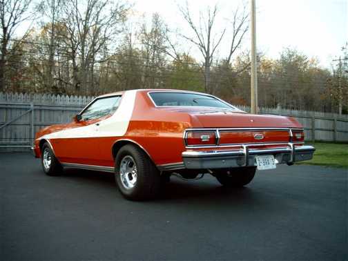 "Hi Mike, Here are some pictures of a new car I have added to the others you have pictured on page 5 of your members photo page. It is a real 1976 Gran Torino Starsky & Hutch model I bought in the fall of 2003. It has a 351 W, factory air, factory am-fm, console, and bucket seats. The car has had a full top to bottom restoration along with a couple of cosmetic modifications to the engine. It came with two build sheets and lots of documentation. It doesn't have the "fun factor" of driving like my Grabber Green 70 Cobra, but it is a great conversation piece at shows and cruise-ins, and I do drive it to all the events! Thanks and take care,