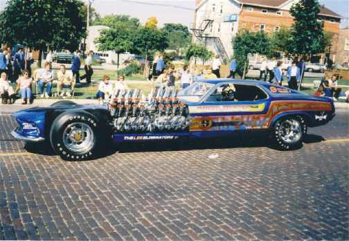 "Mike, Here are some pics of a 69 MACH-1 drag car with 4 -351 windsor mills in it.These pics were taken in 1984 at the Delaven,WI Octoberfest parade.I thought you might want to post these in your drag racer picture file.My last musclecar was a 69MACH-1 so they are very special to me,but everyone has a mustang so I decided to buy a even cooler and rarer car,a TORINO!"