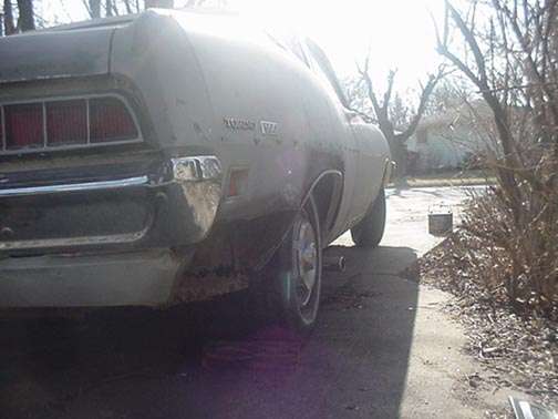 The following comes from Tim Lien of Ames, Iowa. Tim writes "What I am sending now are pictures of my '71 Torino project car. Right now plans are to toss the 302, which I have already tricked out, and dump in a '73 351C and 4 speed tranny. The full story behind the car is kind of interesting, and here it is. I live in Ames, IA (about 30 miles north of Des Moines) and had put my '78 Chevy Nova for sale. I had restored it and scooped it, painted it cherry red, but in the end it was a big disappointment. I was talking to one of my friends about wanting to buy a muscle car, so he suggested checking out an ad for a '71 Torino with a 500cid motor. I was immediately impressed and checked out the ad in the paper. When I called the guy (about 5 minutes later because I didn't want to lose this car) I got his answering machine. So I left a short message giving my phone number and letting him know that I was interested in the car. The guy called back about four minutes later, and guess what, he called collect. I said no to the operator, but had waited too long, so the call was through. I talked to the guy for a few minutes, he was pretty loud and hard to understand seeing as how he spoke in ragged slang. The guy kept telling me the car was old and it wasn't going to be in perfect condition ( I had already figured this out because the car was listed for $500). He also told me that it actually had a 351 motor in it, and that the car and motor would need some work. So, about a week later I was in Des Moines. I called the guy and got through to his answering machine. I told him that I wanted to stop by and look at his car, but he wouldn't have it. He told me to meet him at a Quick Shop or something like that he even asked me what I would be driving. So I said "Ok, I'll be in a Red Chevy Astro, we'll be there," (I was with my dad at the time). I think I told him I would be there at about 5:00 pm, but I took the good 'ol civic to an auto parts warehouse to get some parts for my Nova. When I got back (pretty late) my dad said that he had gone to the gas station and saw no Torino. So I got on the phone and actually managed to reach the guy without talking to that stupid answering machine. The guy was livid, yelling about how he was there waiting for us and had been there for a few hours. I told him that I would try again saying "Do you really want to sell this car?" That finally shut him up and he said we could try again. I told him we would be there in 10 minutes, and he told me to meet him at the airpump. When he finally got there I recognized him immediately even though I had never seen him before. I was ecstatic because he pulled up in a rusted out Caprice. I can tell you I was MAD. But, he told me to follow him, so we did. We managed to follow his no turn signal, no brakelights, rusted out Caprice through the Gangland area of Des Moines to his apartment complex. We finally got to the car, and man was it sad looking. It had four flat tires, but it was a Torino. I didn't get a real good look at the body or motor because it was about 9pm in February, so it was really dark. My dad talked to the dude (he was built, and about 6'4" tall) and seemed to get the idea that he could be worked down to $300. So, we left and I dreamed of the Torino all the way home. About a week later my friend and I drove down to Des Moines and met up with the guy in order to take a closer look at the car. I asked if I could listen to the motor run, so Alfredo (as we now affectionately call this bastard) met my friend and I at the gas station where I bought a little gas to run the Torino and a little gas to get Alfredo's car back to his apartment. When we got back to the car I tried to talk the price down. I kicked the floorpans, "hmm...these are rusted out..." looked at the quarters "hmm...these are gone..." noticed the holes in the hood and the four flat tires too. I did manage to get the guy down to $300. So, it was time for the motor to be started. Alfredo warned me the whole time "It's gonna be loud," (an escuse Alfredo had been using all along to not start the motor.) The guy began by dumping about ten gallons of gas in the Carb and then pumping the gas while cranking the motor. After about ten minutes the engine lurched to life and scared the crap out of me. It sounded just like one of those alcohol funny cars. Alfredo killed the motor and let me know that it was time for him to go get his free meal down town, but we could meet him later. So, my friend and I went to best-buy and he bought a lot of electronics. We debated whether or not I could afford to buy the car then and if he could loan me the money. We decided to just tell Alfredo that we didn't have the money (he had suggested that I take a loan from my friend). We rolled up to the gas station with a car load of brand new electronics and I told him I didn't have the money and my parents said I could put any down on the car. I went back to Ames a little dejected because I didn't have a car and that I might have to deal with this loser again. The Nova finally sold and I went directly to Des Moines. I met Alfredo at the gas station and he wrote out the bill of sale and application for title. I drove Alfredo around Des Moines for about two hours (because he needed a van to hall DJ equipment) and he chilled with his otha gangstah homeys. We made it to Reiman music where Alfredo argued with the clerk for a seeming eternity and finally they agreed on a price. Then, Alfredo called on me to sign for the thousand dollars worth of equipment using my driver's license (he conveniently left it at home). Luckily one must be at least 18 to sign for this kind of stuff. Prior to getting to Reiman music I had stopped at the bank and withdrawn the total amount plus 50 bucks for the tow. We finished the deal in the parking lot and he assured me the car would be delivered that day. I got home and waited, and waited. The car didn't show up. The next day I called Alfredo and he said that he co