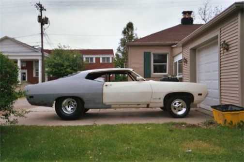 The following comes from Todd Mast in Archibold, Ohio. Todd writes "Hey Mike , I love the website. I'm 34 years old and I got my first car when I was 15. My choice was between a 73 mustang and a Huge white Torino. The Torino caught my eye, it had a big block and a 4spd. I drove the car through high school that way. After school I bored the engine and installed lots of goodies, dual fours and nitrous. I started doing some research and found out the car was a 351 GT. The car has sat four 13 years , and over the years it has suffered. I wanted to repair this vehicle but the already to far along, to put it back to original, so I started a project. I hope that you don't think to terrible of me for what I have done to this fabulous breed of a vehicle. I am sending my beginning pics, and the my process. THANKS AGAIN for a wonderful site. Todd from Archbold Ohio"