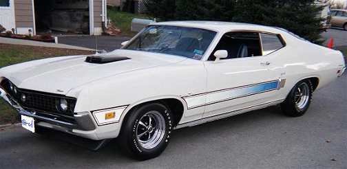 The following comes from Torino Steve in Rhode Island. Steve writes "Here it is Mike, The photo!!!!! It was taken today! 3-12-01 a blistering 25* out ! It fits the car as my son calls it"" Snowball""....he's 4 years old!. This 1970 Torino GT is white on blue with a 351C 4V engine/3 speed/ 9" rearend with 3.50 gears, Bucket seats and a console.. shaker hood ,rear window slats and last but not least...molded carpet!. well i hope you like it.. I do! PS. No!! i don't drive it in the snow, just had it out to run the engine! guys...........Thanks Mike!! Torino Steve from Rhode Island."